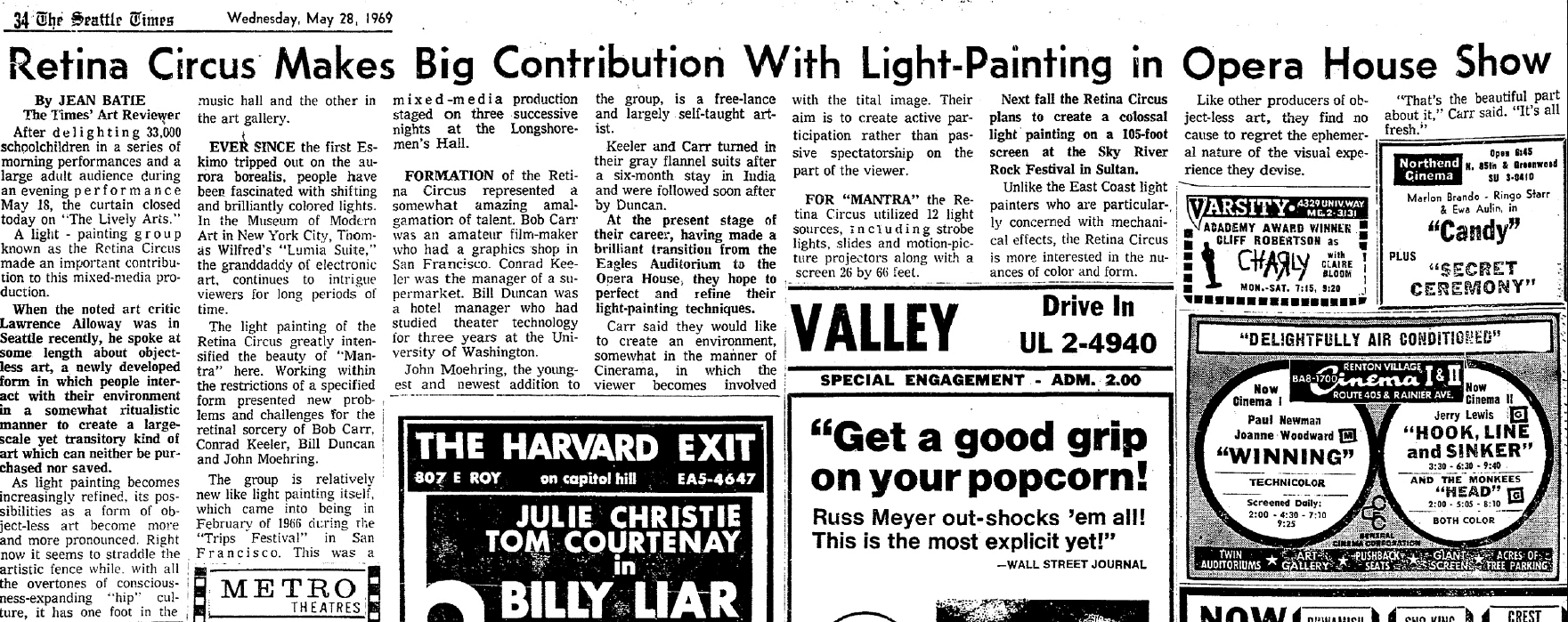 I was a member of Retina Circus starting in 1968. We used 3 Beseler Transpaque overhead projectors (with the front surface parabolic mirrors) with 1000 watt bulbs, 4 Carousel slide projectors modified to 900 watts with external fans (required glass mounted slides) So - there it is, a quick thumbnail for your database. Andy Neddermeyer (InVision Productions) - August 2002 |